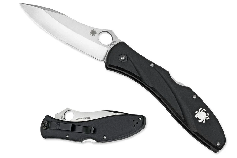 The Centofante 3 has a thin-profiled, lightweight FRN handle. Two channels are furrowed out of the handle for better grip and a Palladium silver Spyderco bug is inlayed into its surface. For added security and convenience the back-lock is positioned midway on the spine and David Boye Dent is cut from the locking lever. The VG-10 blade has both a hollow-grind and swedge-grind with non-sharpened spine serrations (jimping) to hold the thumb steady when cutting. A black steel pocket clip positions for tip-up/down, right-hand carry.