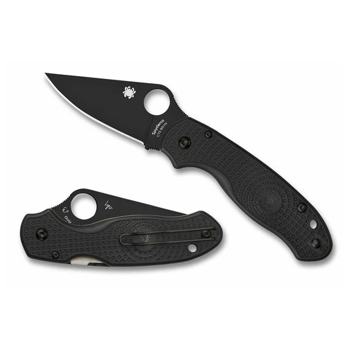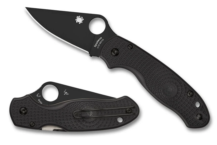 Its PlainEdge blade is full-flat ground from CTS BD1N stainless steel and supported by a streamlined version of Spydercos patented Compression Lock mechanism. To complement the blades finish, the screws and reversible deep-pocket carry clip on its injection-molded, fiberglass-reinforced-nylon (FRN) handle also sport a non-reflective black coating.