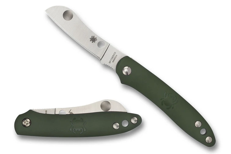 Unlike a traditional slipjoint, the Roadies blade is held open by an improved notched-joint mechanism. Its spring also forms the handles full-length back strap, giving it structural strength and providing a foundation for the durable fiberglass-reinforced-nylon (FRN) scales. The injection-molded scales are contoured for comfort and feature a recessed Spyderco bug logo on both sides. They are also available in a wide variety of colors to suit every taste.