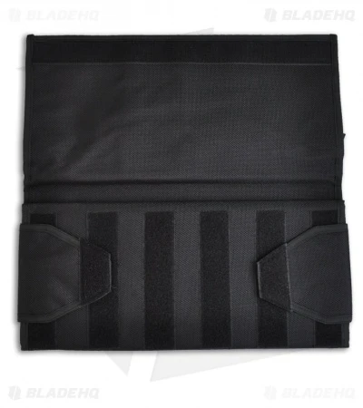 Constructed from heavy-denier polyester Cordura, the pack has eighteen deep pockets sized to hold even larger folders. Each pocket is fronted with a clear plastic window for viewing knives tucked inside. It tri-folds over and seals closed by way of a Velcro strip running the width of the pack. The knives remain secure and separated in their pockets and cannot rub or scratch against each other. An adjustable length shoulder strap attaches with two durable steel D-rings letting you hang the pack for display on a wall or sling it over your shoulder to take with you. Spyderco’s name and bug logo are embroidered in gold thread on the closing flap. Available in black.